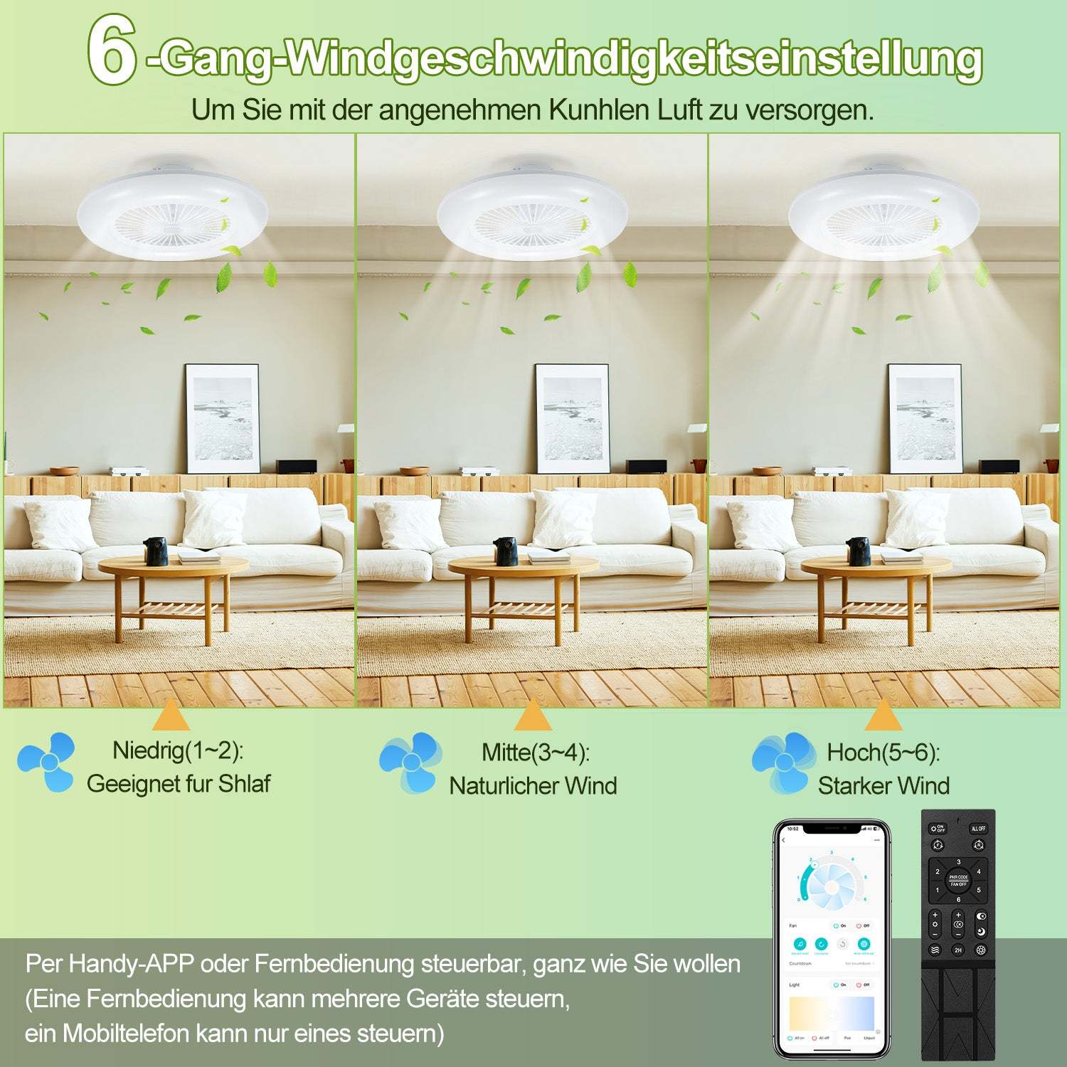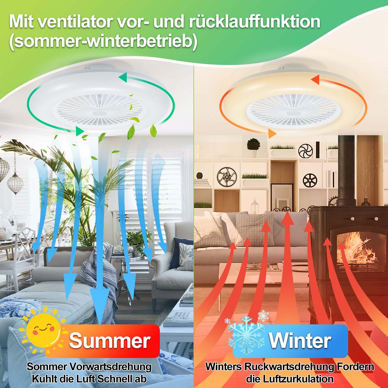 Vorwärts- und Rückwärtsfunktion: Dank der umkehrbaren Ventilatorfunktion können Sie den Ventilator das ganze Jahr über effektiv nutzen. Im Sommer sorgt der Vorwärtsmodus für eine erfrischende Brise, während der Rückwärtsmodus im Winter dabei hilft, die warme Luft gleichmäßig im Raum zu verteilen.
