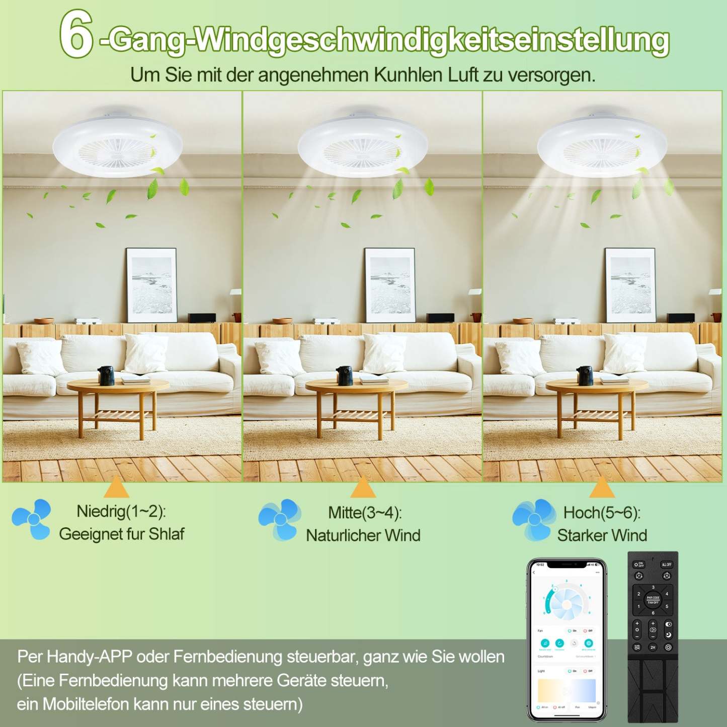 Hochwertige Materialien: Der Ventilator besticht durch hochwertige Materialien wie eine Lampenabdeckung aus erstklassigem Eisen und PC-Material sowie langlebige ABS-Flügel. Zusätzlich verfügt er über einen Frequenzumrichter-Motor aus reinem Kupfer, der eine zuverlässige Leistung gewährleistet.