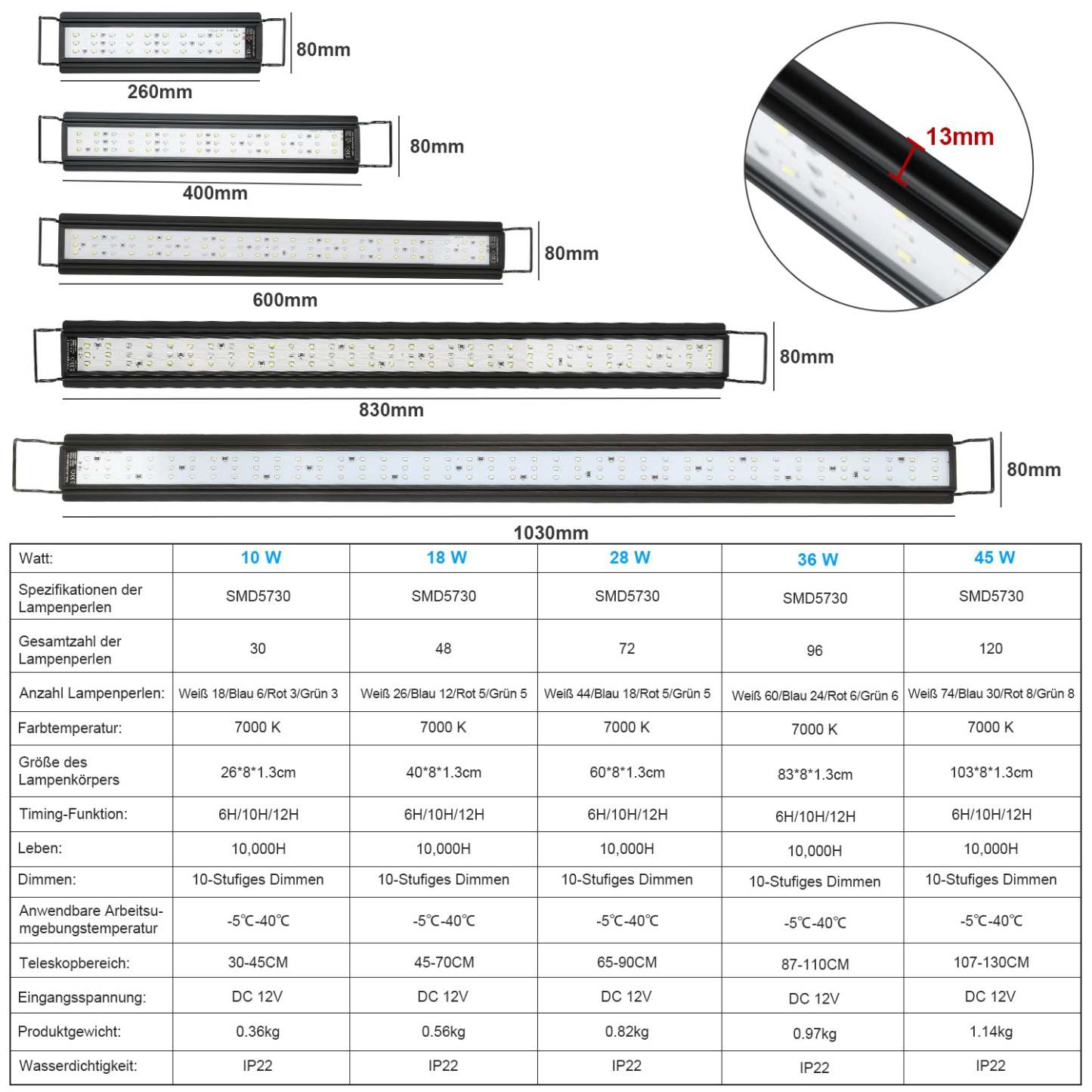 �Energiesparend und hochwertig: Die Aquarienleuchte besteht aus Aluminium, der die vom Licht erzeugte Wärme schnell ableiten und die Leuchttafel schützen kann. Hochwertige SMD-LED-Technologie kann Energie sparen und die Produktlebensdauer verlängern.