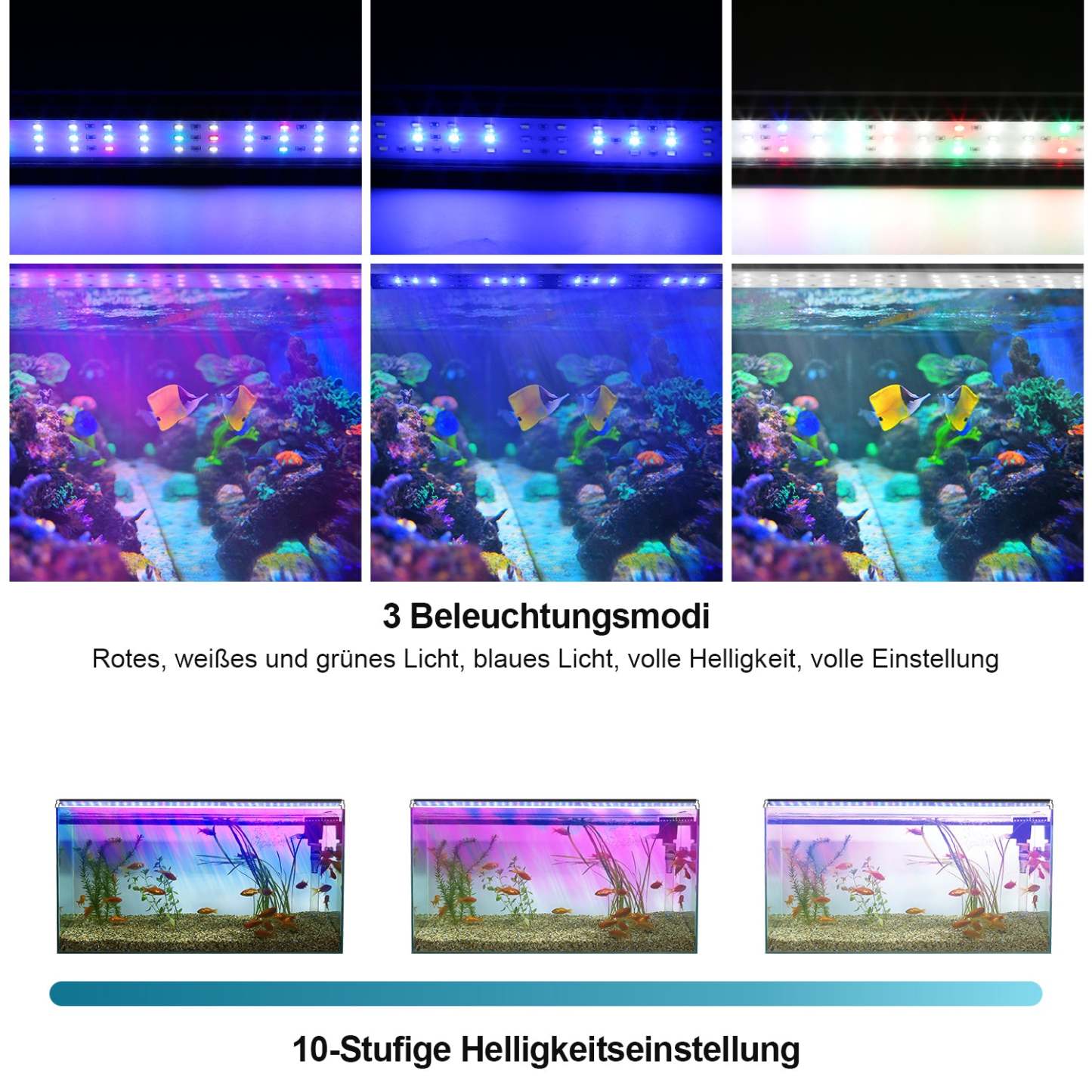 �3 Lichteffektmodi: Weiß hat Photosynthese und kann das Wachstum von Pflanzen fördern; blaues Licht kann das gesunde Wachstum von Korallen fördern; Rotes Licht kann das gesunde Wachstum von Fischen fördern, Vollspektrum-LED kann dem Aquarium helle Farben verleihen und den dekorativen Effekt verbessern.