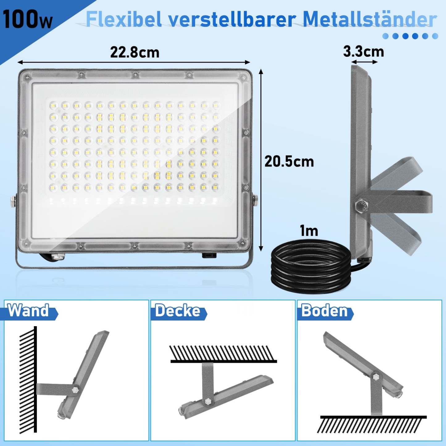 【Breiter Beleuchtungsbereich】Der LED-Strahler hat einen Abstrahlwinkel von 120° für eine Rundum-Beleuchtung. Der breitere und dickere verstellbare Metallbügel ermöglicht die Installation des LED-Strahlers in verschiedenen Winkeln an Decken und Wänden. Der Lampenkörper kann um 180° verstellt werden.