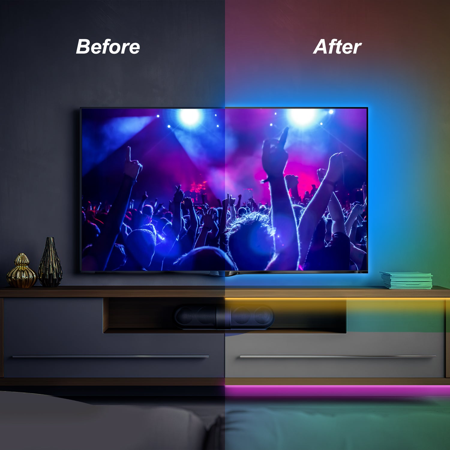 【Leistungsstarke Farbe】Das Hinzufügen von LED-Streifen auf der Rückseite des Fernsehgeräts kann die Belastung der Augen verringern, die durch den Helligkeitskontrast im Dunkeln verursacht wird. Der LED-Lichtstreifen verfügt über fortschrittliche LED-Lampenperlen, ausgestattet mit einem LED band mit Dimmer und Helligkeit.