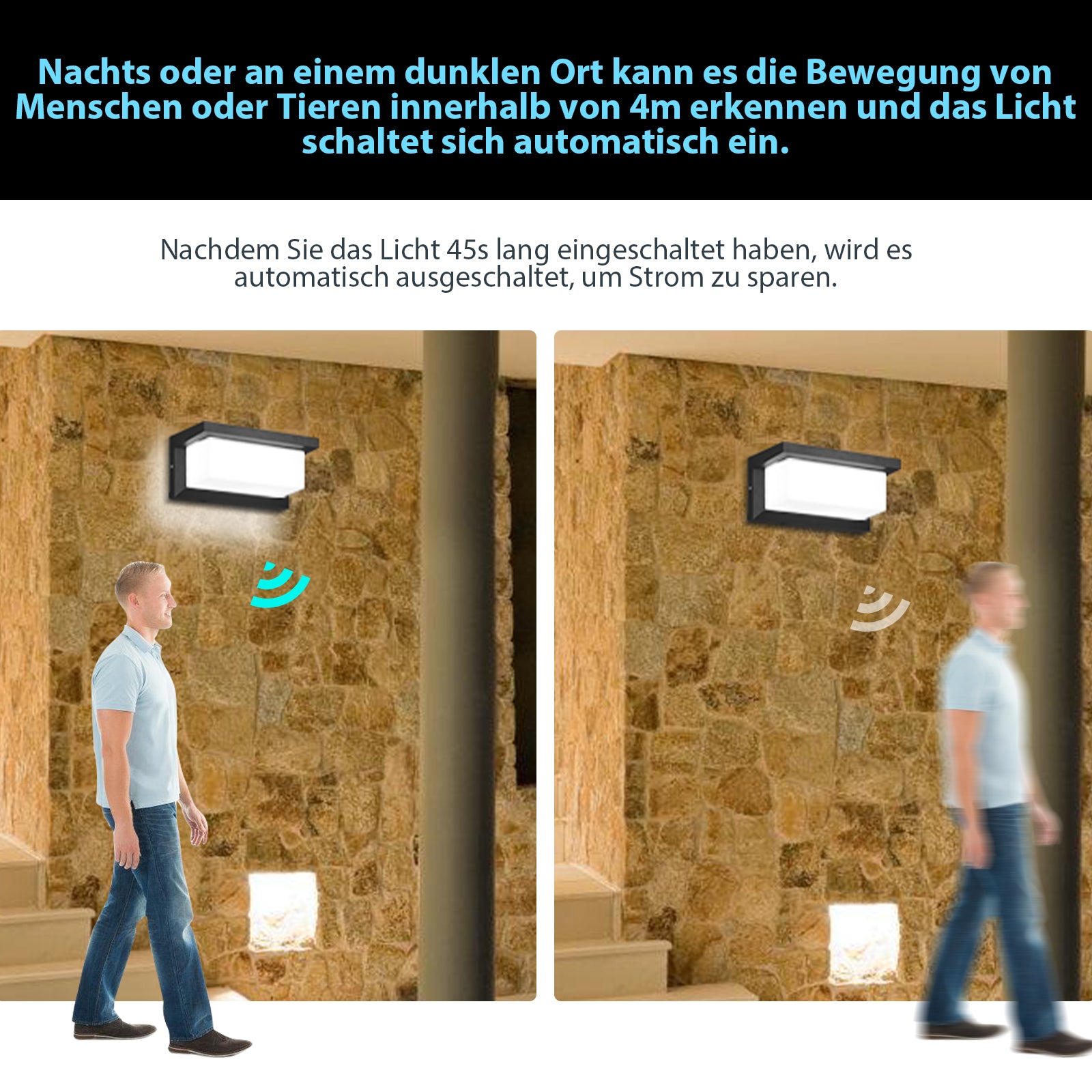 【Mit Bewegungserkennungsfunktion】 18W Außenwandleuchte mit Bewegungsmelder. Solange es nachts oder an dunklen Orten die Bewegung von Menschen oder Tieren innerhalb von 4 Metern erkennen kann, schaltet sich das Licht automatisch ein und nach 45 Sekunden automatisch aus, um Strom zu sparen.