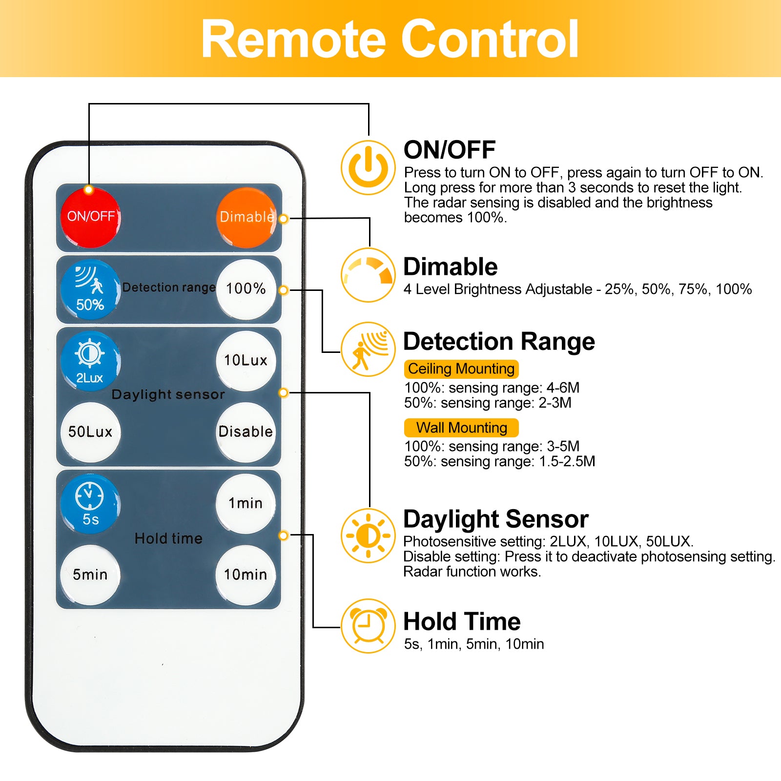 Einstellbar: Erfassungsweite: 100% Modus und 50% Modus.Dämmerungsschwelle: 2lux/10lux/50lux.Leuchtzeit: 5s/1min/5min/10min