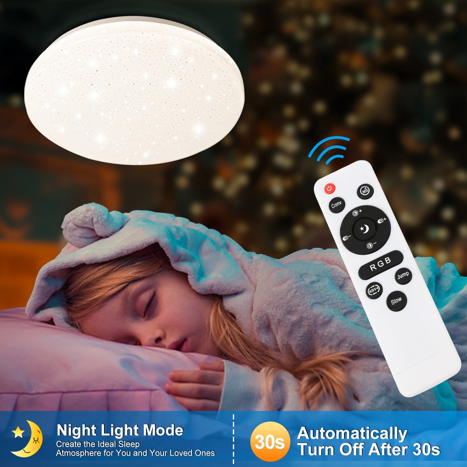 【Nachtlichtfunktion und 30-zweite-Timing-Funktion】Durch die Nachtlichtfunktion kann die Deckenlampe sogar die ganze Nacht leuchten.Sie können die Lampe 30s später so einstellen, dass sie sich selbst ausschaltet, sodass Personen, die zum Schlafen Licht benötigen, das Licht nicht die ganze Nacht eingeschaltet lassen müssen.