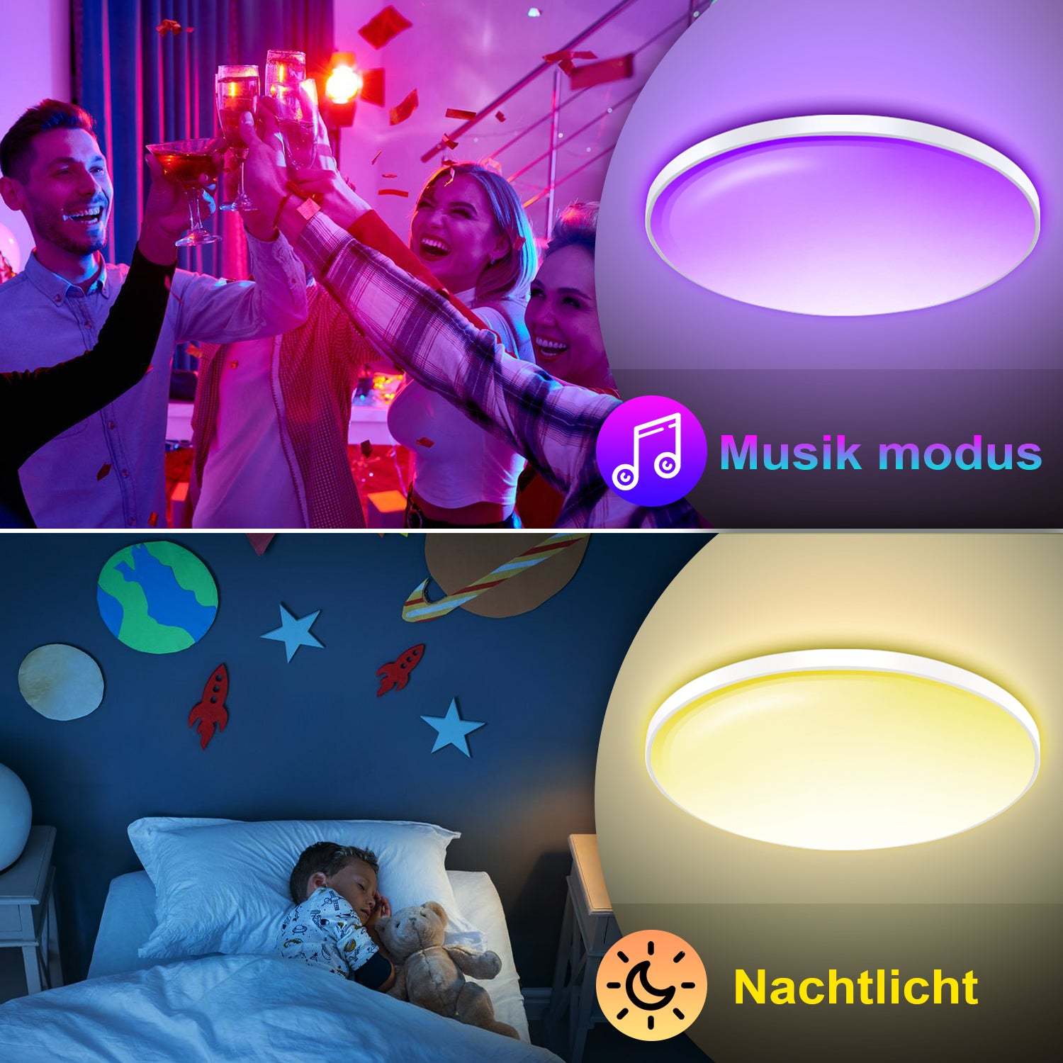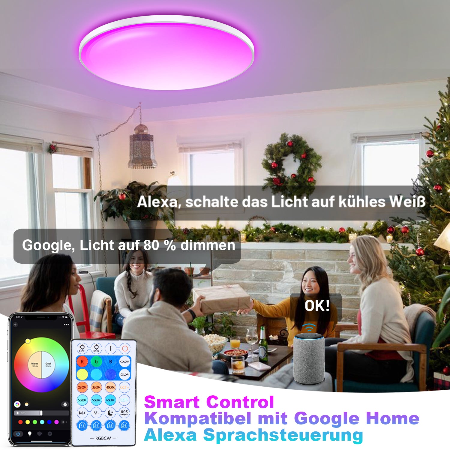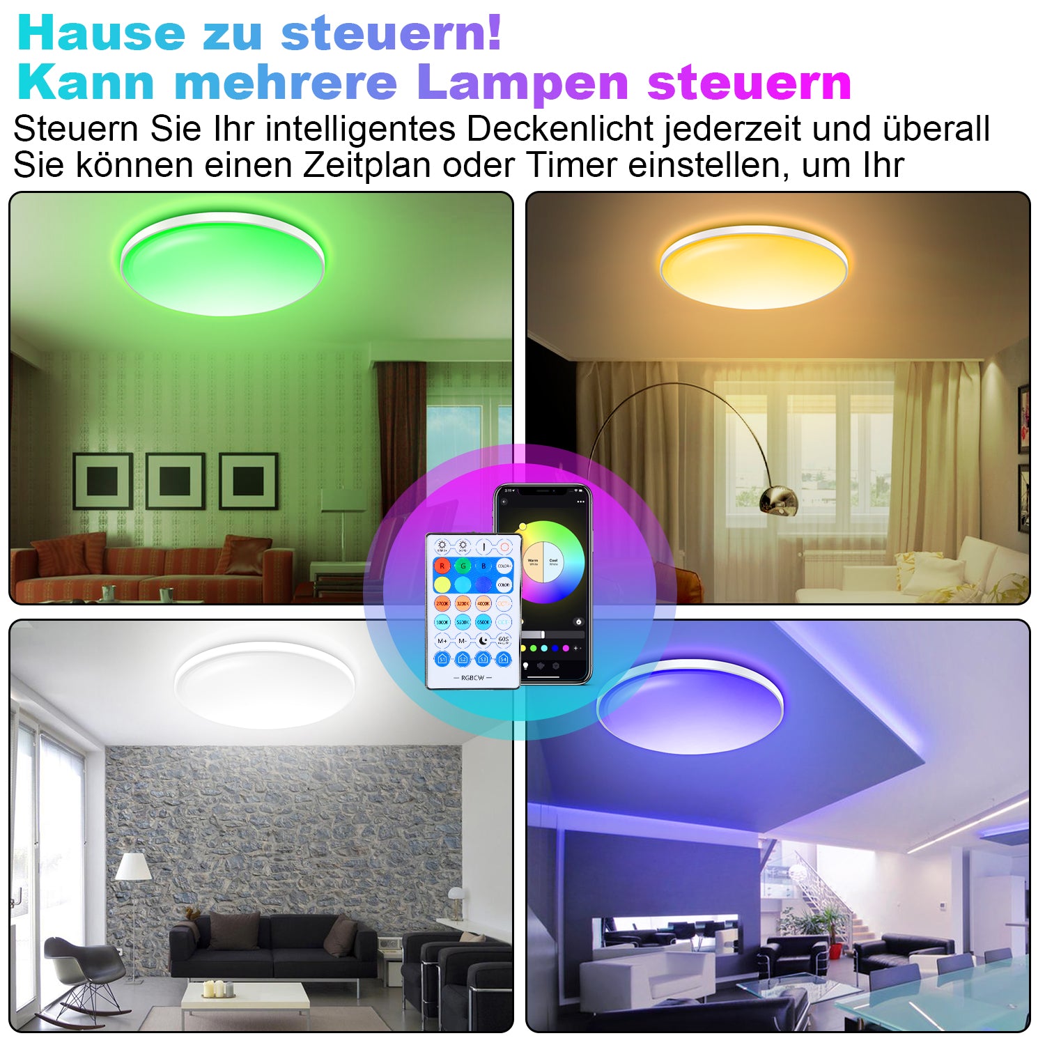 �Drei-in-Eins-Nutzung: Dieses Licht kann über die Fernbedienung, APP und Alexa, Google Assistant-Lautsprecher gesteuert werden. Sie können aus einer Vielzahl von Möglichkeiten wählen, um die unterschiedlichen Bedürfnisse der Familie zu erfüllen und das Leben im Smart Home zu verwirklichen.