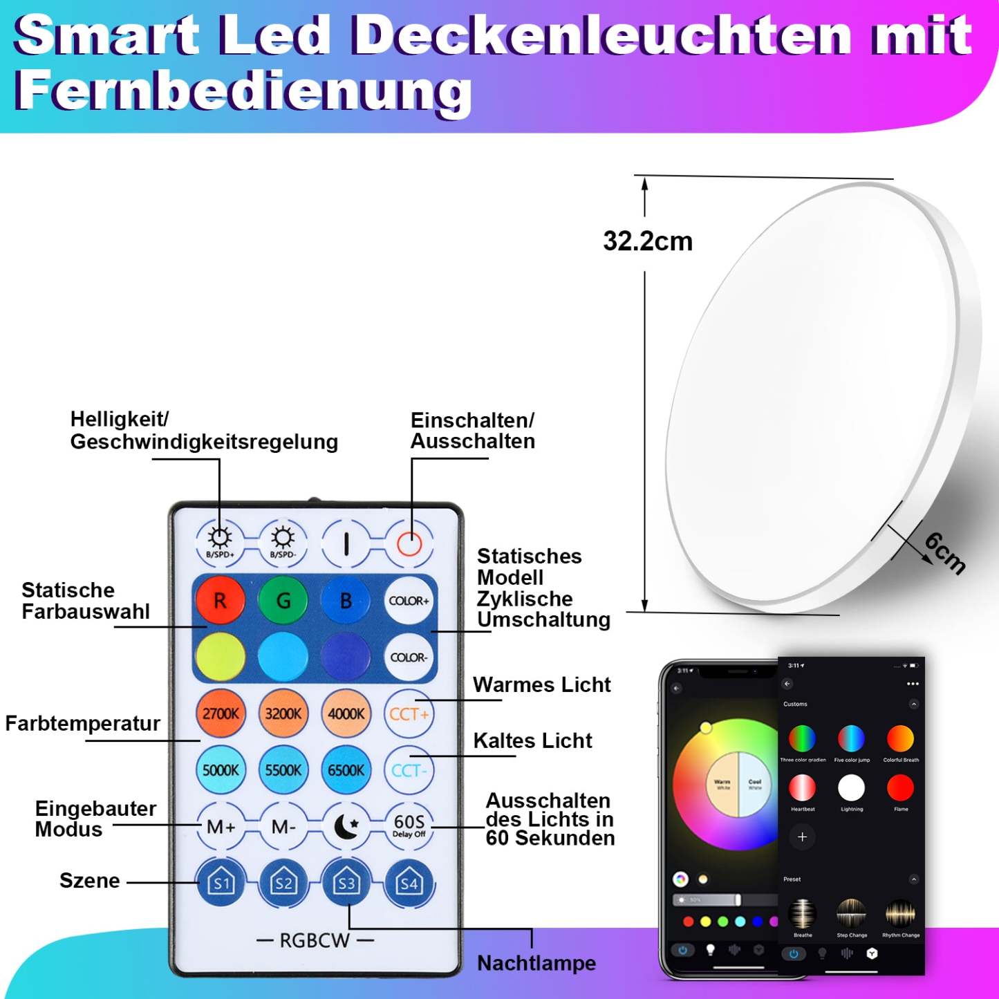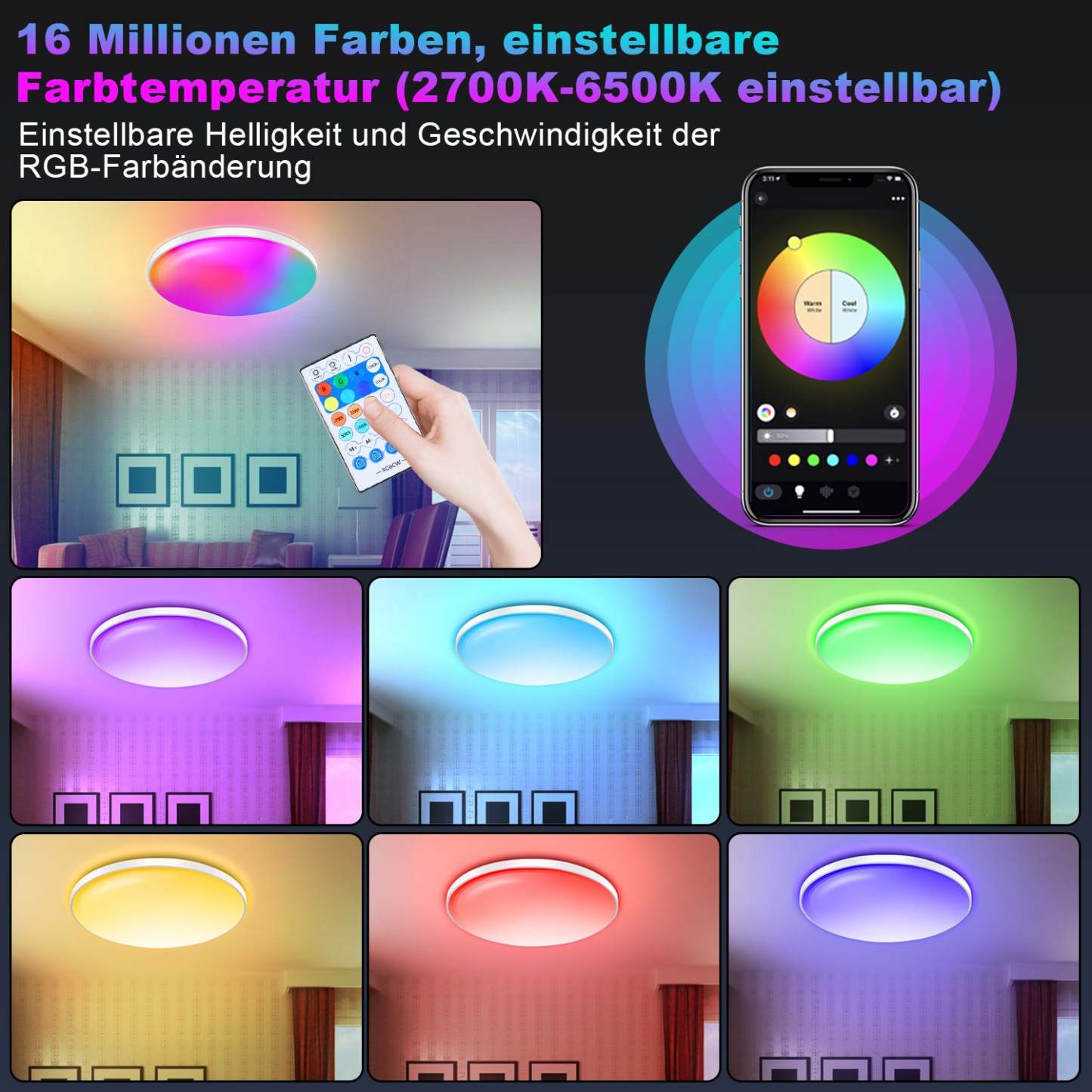 �30W 3200LM Deckenlampe verfügt über 16 Millionen RGB-Farben wie Warmweiß, Naturweiß und Kaltweiß (2700K-6500K). Die Helligkeit des intelligenten Lichts kann von 0% bis 100% jeder Farbe eingestellt werden. In der Anwendung stehen Szenen zur Auswahl, und Sie können auch die gewünschten Szenen erstellen.