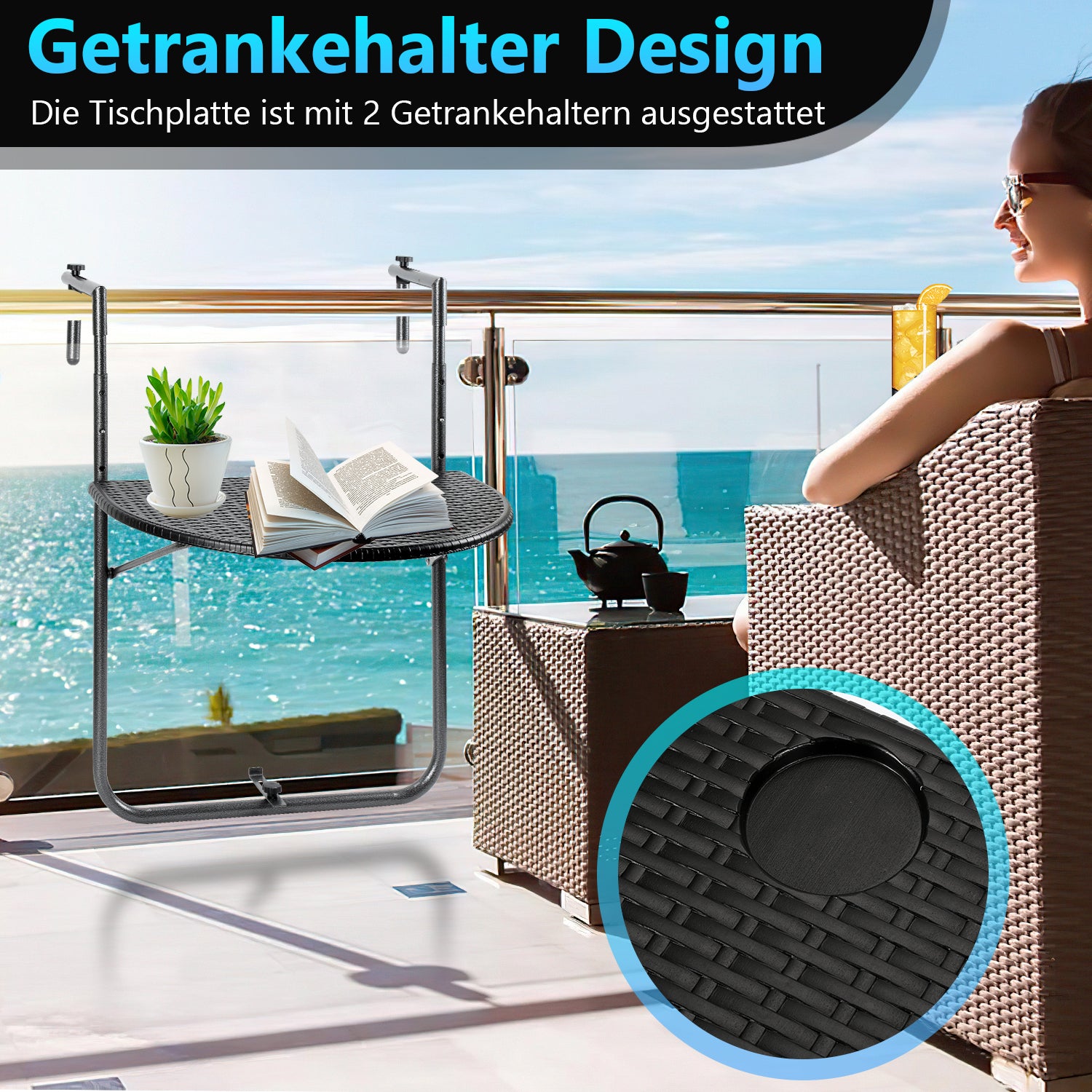 【Integrierter getränkehalter】Besonders praktisch sind die beiden Getränkeausläufe am klapptisch balkon,die auch bei Wind für die Standfestigkeit des Getränke-/Kaffeebechers auf dem tisch klappbar sorgen.