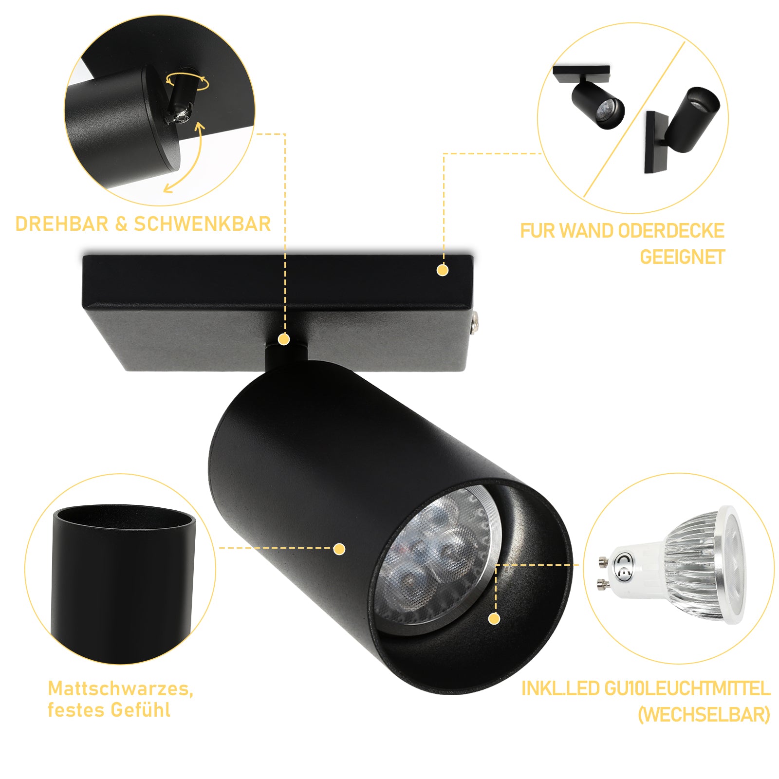 Einzelkopfstrahler: 1 Einzelkopfstrahler + 1 warmweiße GU10-Lampe