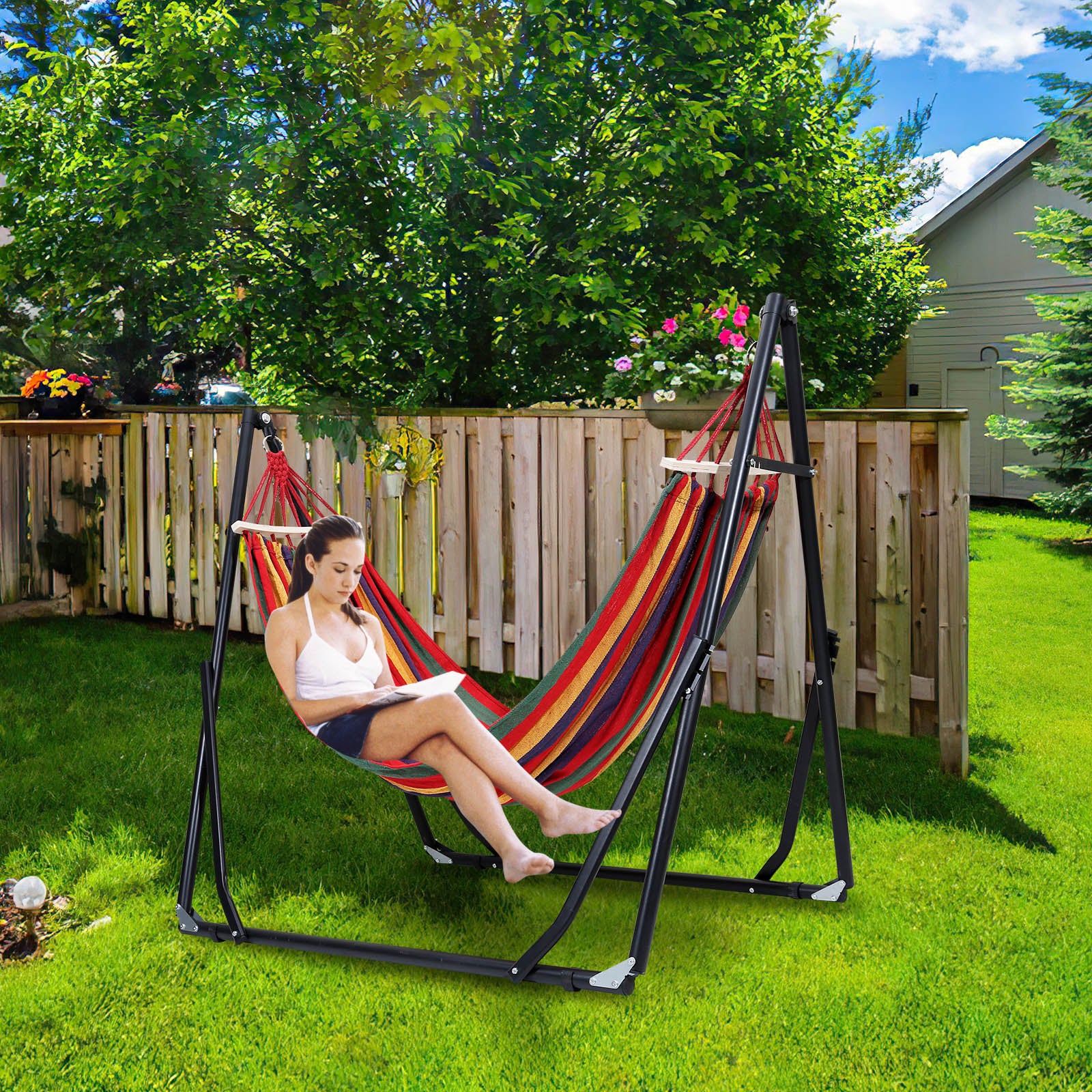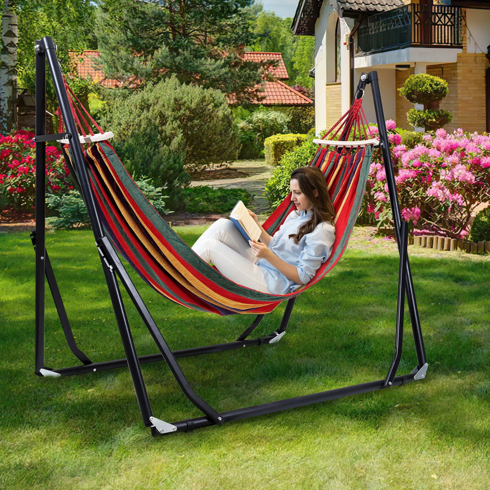 ✨【Faltbare Hängematte mit Gestell】Die verstellbare Höhe und Länge dieses Hängemattenständers bietet mehr Platz für zwei Personen und der Ständer kann bis zu 150 kg tragen, perfekt für die Unterhaltung mit Familie und Freunden im Garten, auf dem Rasen oder am Pool.