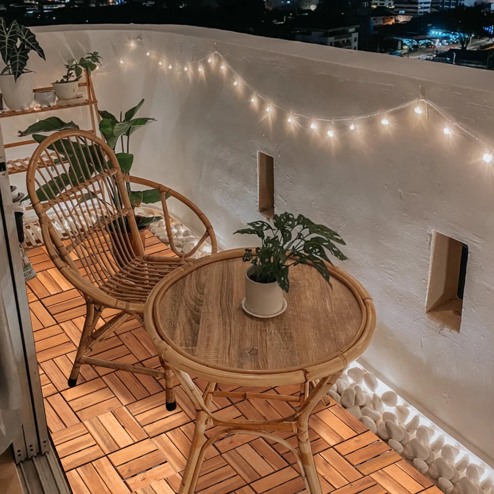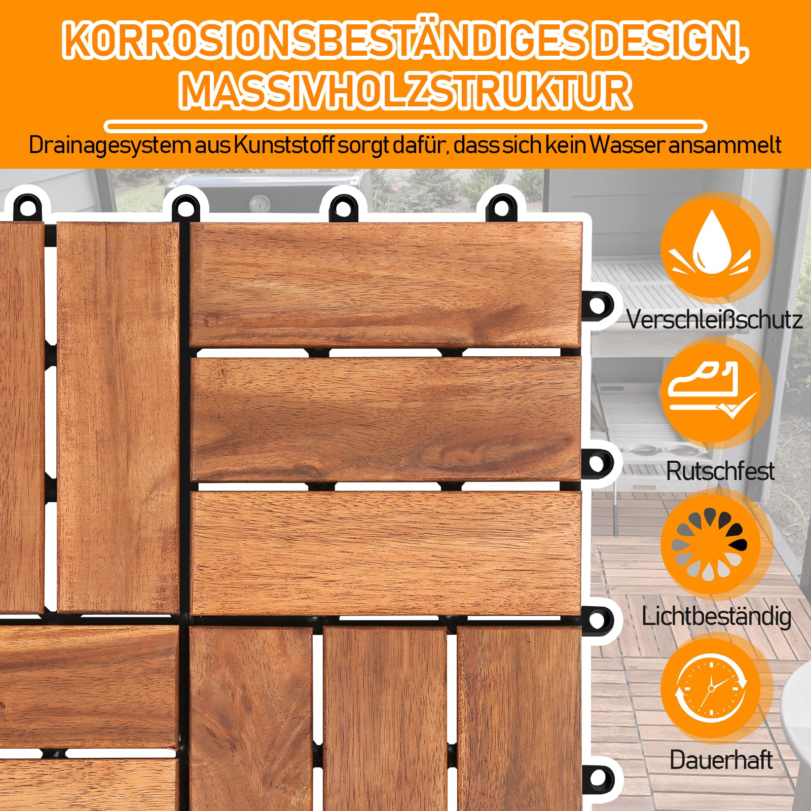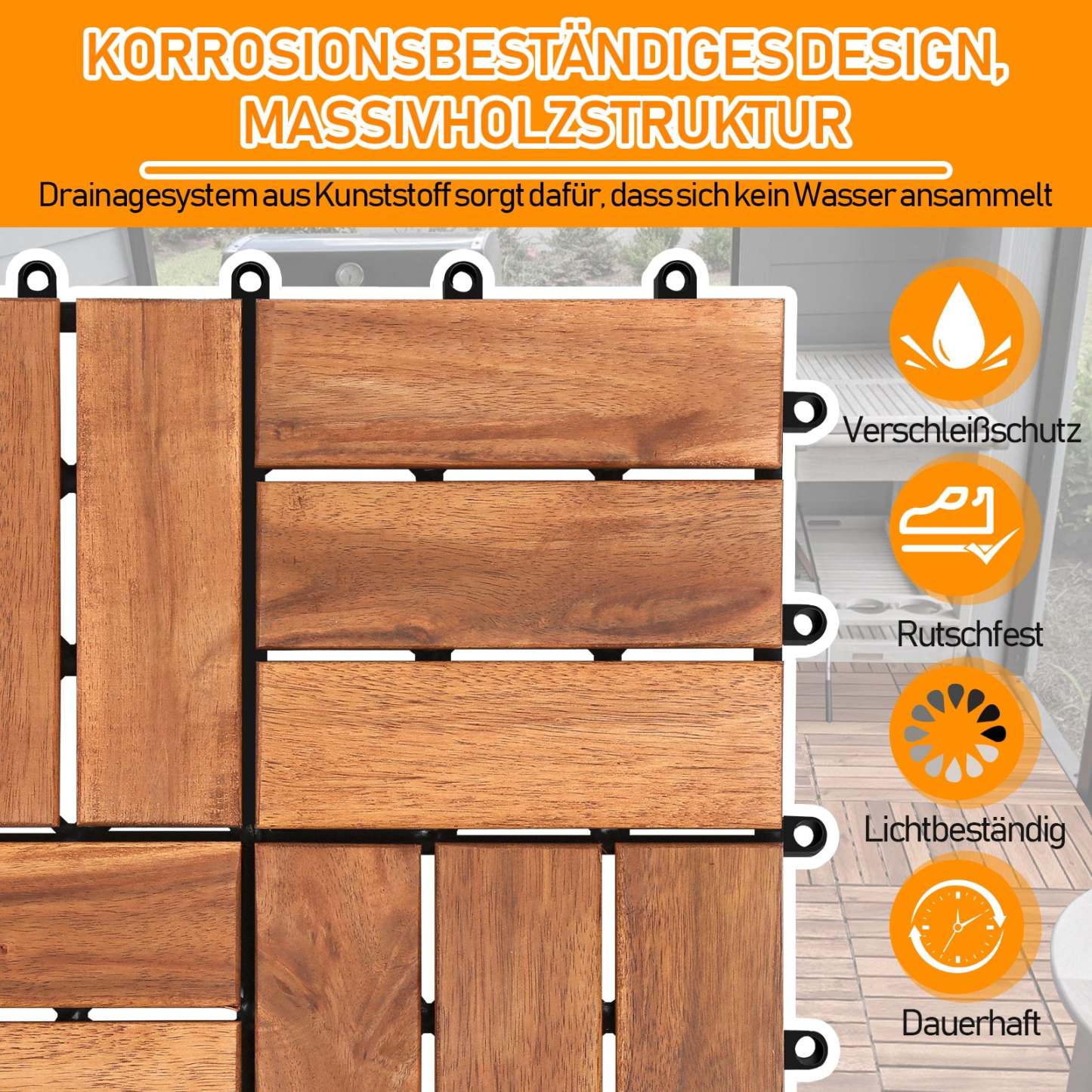 �Angefertigt aus FSC-zertifiziertem, hohe qualität Akazienholz. Der Untergrund der Holzfliesen wurde stark verbessert, sodass ein Brechen der einzelnen Fliesen präventiert wird. Die Terrassenfliesen sind 30x30cm groß, für einen m² sind ca. 11 Fliesen notwendig.