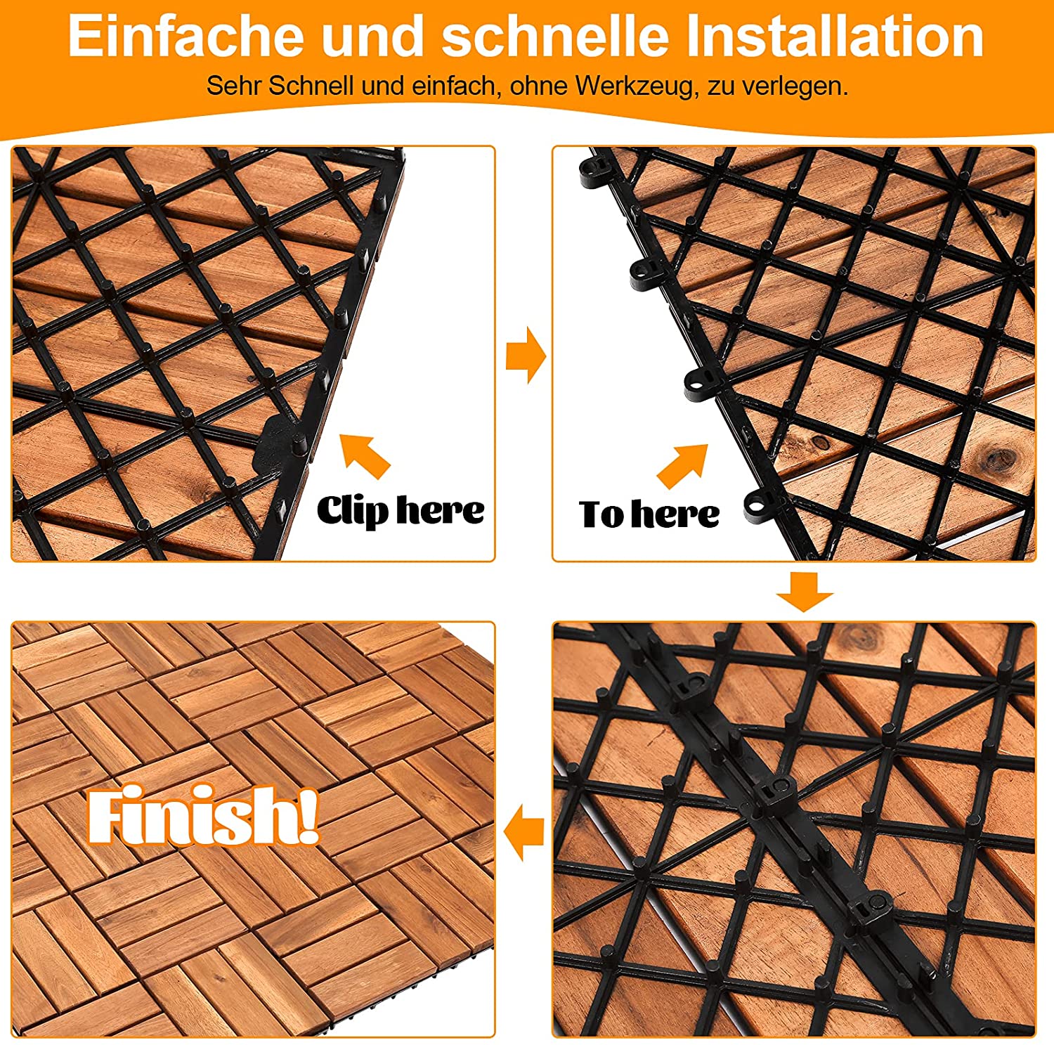 �Einfach und bequem, kein Werkzeug nötig. Die Holzfliesen haben ein Stecksystem, Die Fliesen werden einfach ineinander verhakt, so dass eine stabile einheitliche Fläche entsteht. Hinweis: Um die Langlebigkeit des Produktes zu garantieren, sollte ein flacher Untergrund gewählt werden.