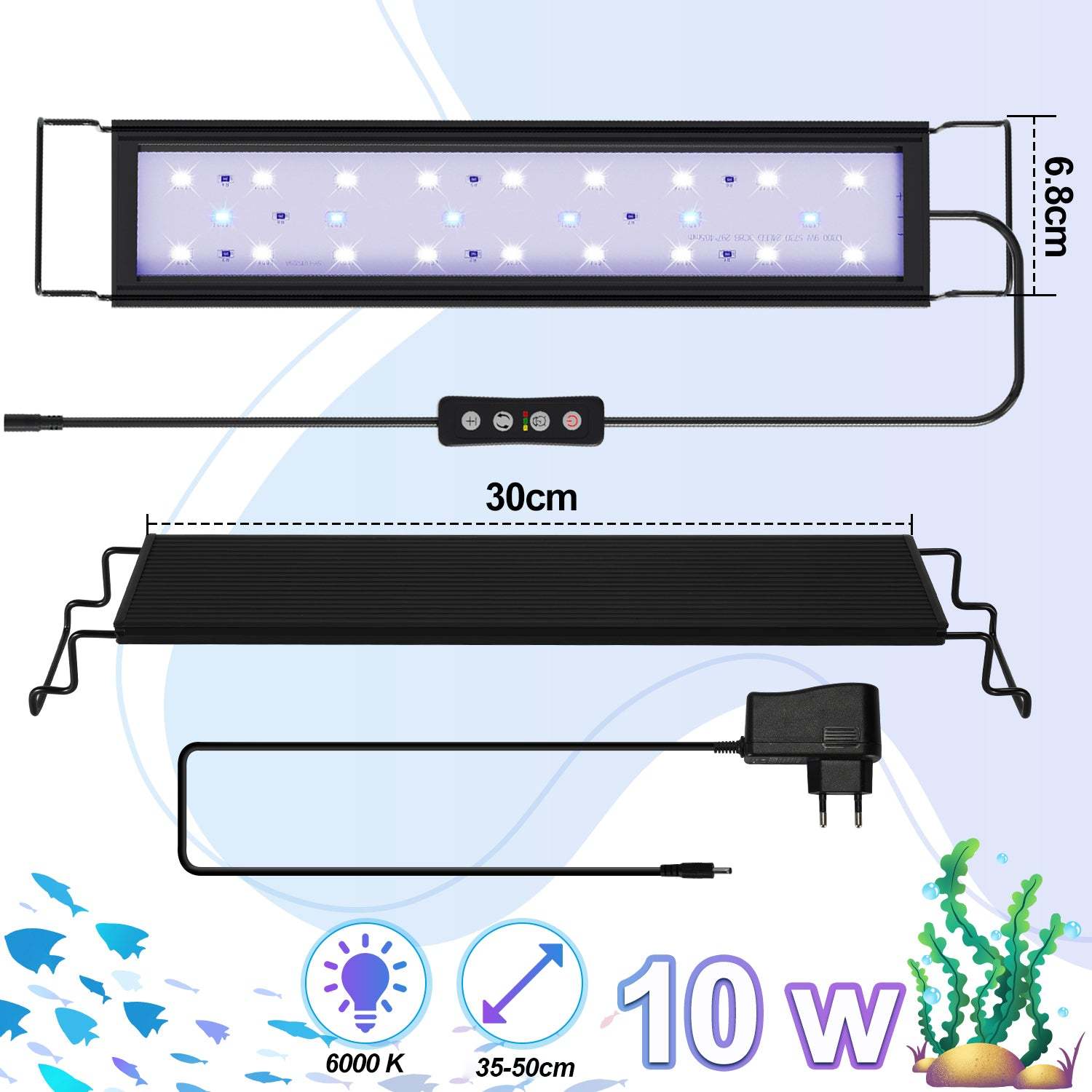 Das 12W LED-Aquarium verfügt über 18 weiße LEDs und 6 blaue LED-Lampen für ein 35-50cm Aquarium