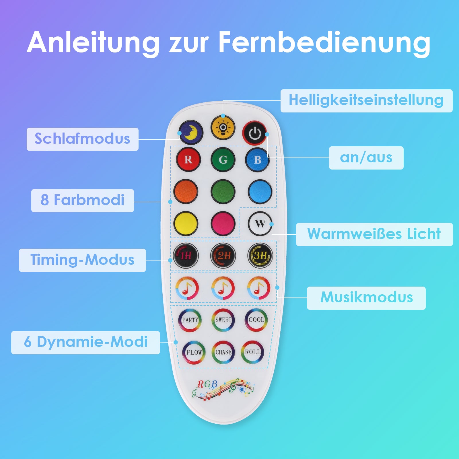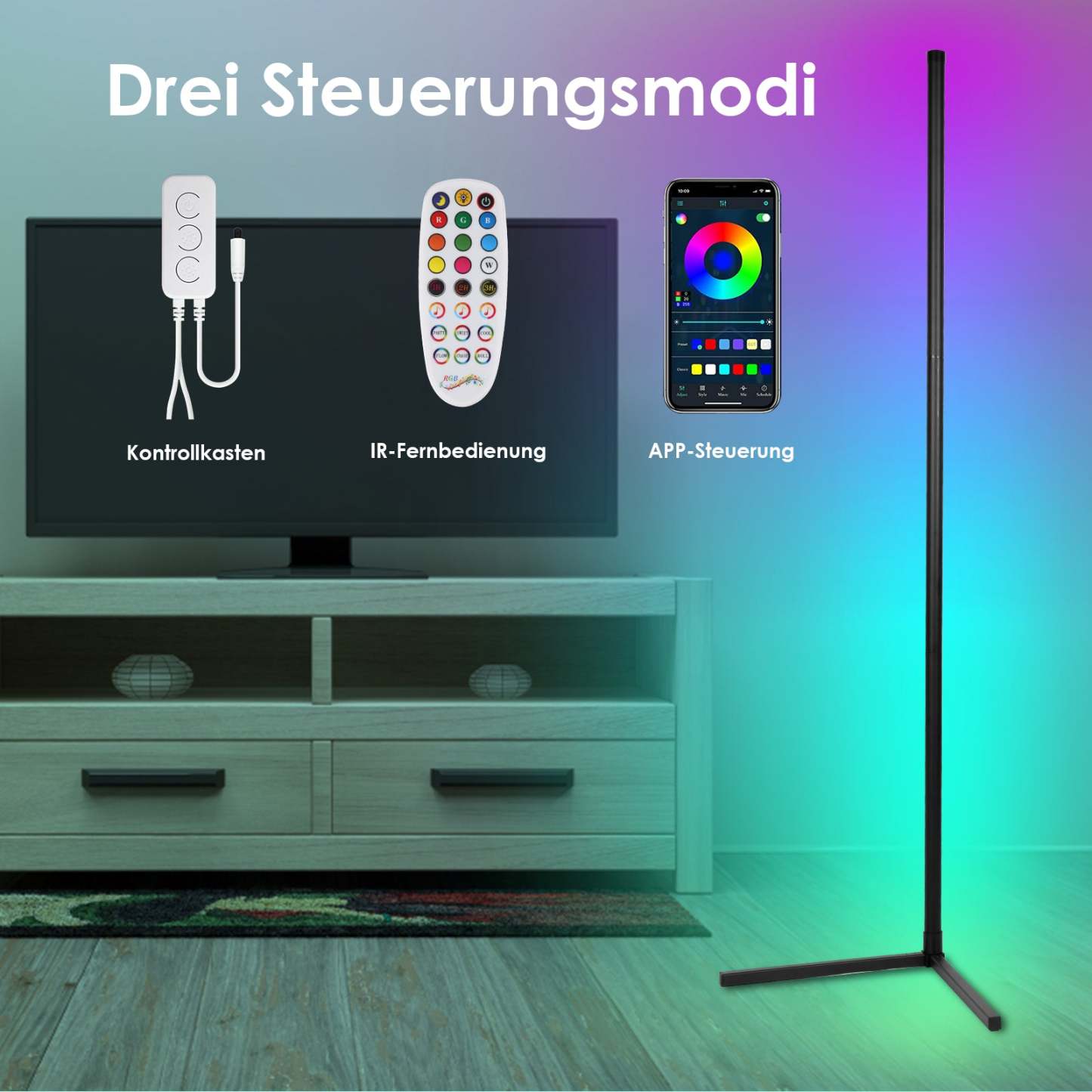 Steuerungsmethode: Infrarot-Fernbedienung, App, Steuerbox