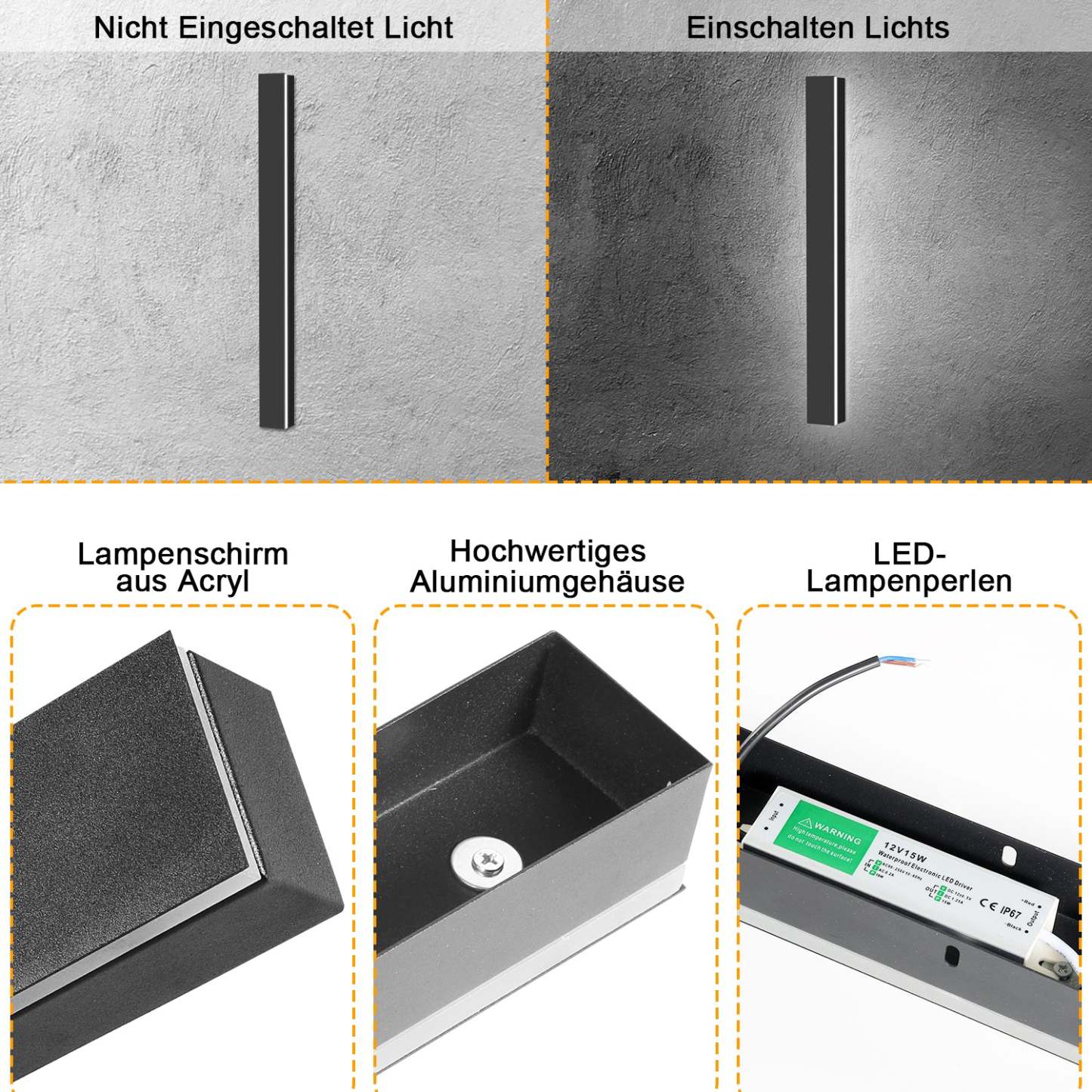 IP65 wasserdicht: gute Wasserdichtigkeit und Luftdichtheit; geeignet für die Installation im Duschraum oder Garten im Freien. Die Lebensdauer der Wandleuchte beträgt bis zu 50.000 Stunden.