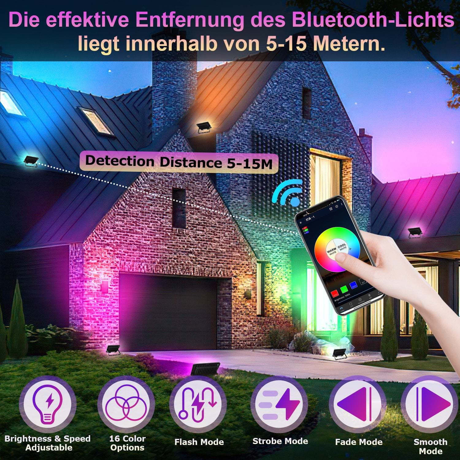 �Intelligente Steuerung: Unsere RGB Flutlichter bieten intelligente Farbänderung über eine Smartphone-Bluetooth-App. Mit 16 Mio. Farben, 20 Modi, Musikrhythmus und Zeitschaltung sind sie ideal für Innen- und Außenbeleuchtung.